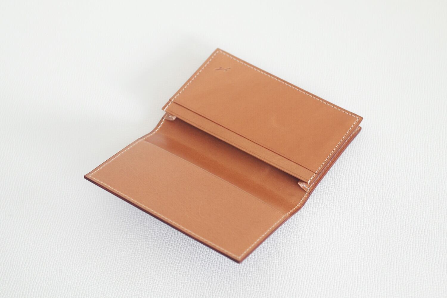 内装のナチュラルキップレザーとあわせて育てるのが楽しみな名刺入れに仕立てました。